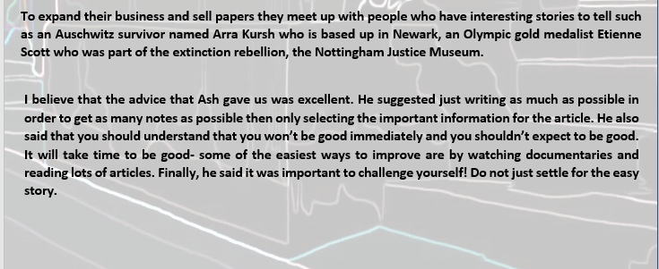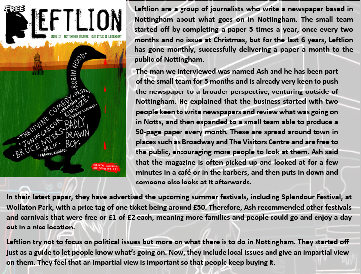Interview with Leftlion magazine. What do they do? Who are they? What advice would they give aspiring journalists? nottinghamhighschooljournalism Uncategorized 3rd Jul 20193rd Jul 2019 1 Minute Share this: Click to share on X (Opens in new window) X Click to share on Facebook (Opens in new window) Facebook Like Loading... Related Published by nottinghamhighschooljournalism View all posts by nottinghamhighschooljournalism Published 3rd Jul 20193rd Jul 2019