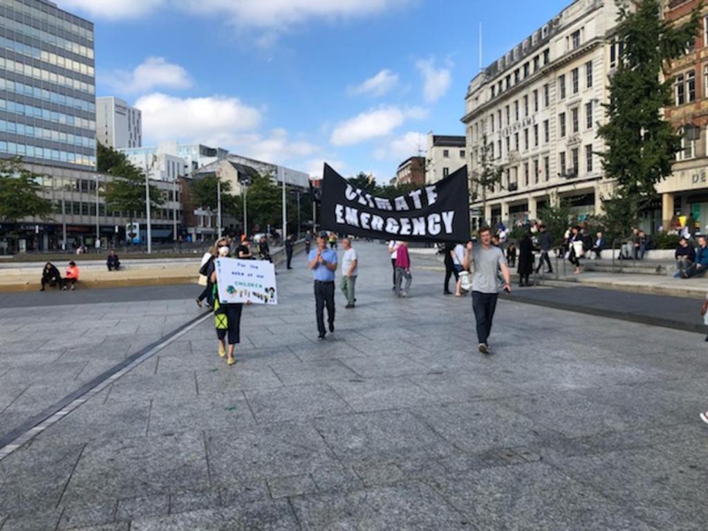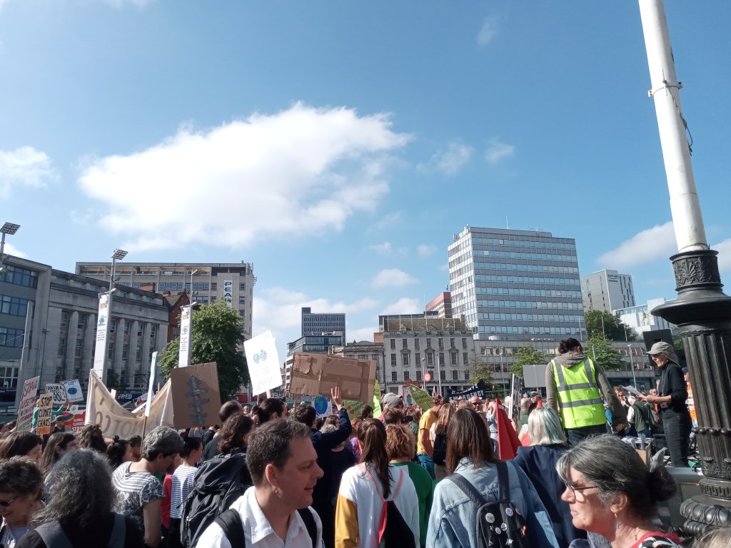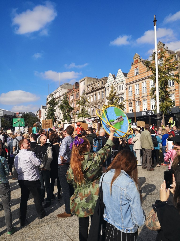 In Nottingham, there were 2 different protests in the town centre- we visited one of them- they were in front of the city hall. The idea was to increase awareness for people who are oblivious to this modern issue. They were working with extinction rebellion. We spoke to the woman who organised this particular protest. She said that she wanted to increase the profile of the protesters but it was very small to start as you can see in the image on the right. However, when we revisited later, it grew in size throughout the day. Many people held up boards with powerful messages. The woman also said that it was just a small gathering whereas “other people are lying down in banks…”