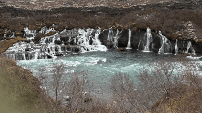 On Tuesday, we headed on the bus for a few hours up to Grábrók crater, that was formed roughly around 3000 years ago and is surrounded by a lava field. After the craters we went to Hraunfossar and Barnafoss waterfalls and rapids, which come from under lava into the Hvitá River. It was quite a slippery visit due to the combination of water and cold temperatures.